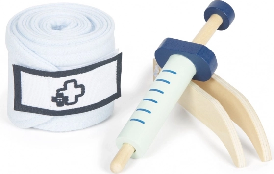 Die Spritze hat einen beweglichen Kolben und der Verband wird mit Klettverschluss geschlossen. Kinder genießen ein realistischeres Spiel und trainieren dabei die Feinmotorik.