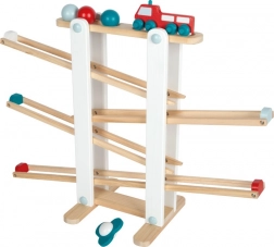 Die spannende Abfahrt von Kugeln und Auto über vier stabile Bahnen hält Kinder in Atem und fördert Konzentration, Reaktionsvermögen und Hand-Auge-Koordination.