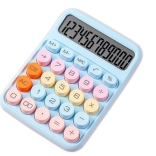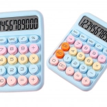 Der Taschenrechner ist blau, was ihm ein elegantes und modernes Aussehen verleiht. Das Gerät verfügt über große, komfortable Tasten in verschiedenen Farben: rosa, blau, gelb und orange, was eine schnelle und intuitive Dateneingabe erleichtert.