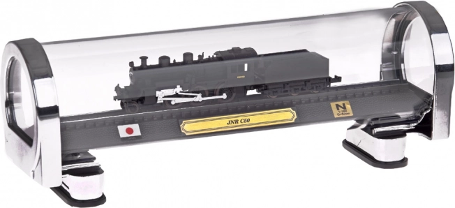 Entdecken Sie ein stilvolles Sammler-Highlight: die Dampflokomotive JNR C50 als präzise Maßstabsreproduktion 1:160. Das Modell sitzt auf einer realistischen Gleisbasis mit Schild für Name und Maßstab und wird durch die Flagge des Herkunftslandes ergänzt. Die zylindrische Vitrine aus klarem, starkem Kunststoff ermöglicht detaillierte Betrachtung und schützt zugleich vor Staub und Stößen.