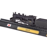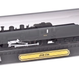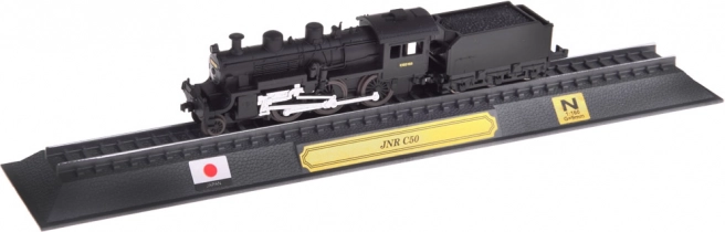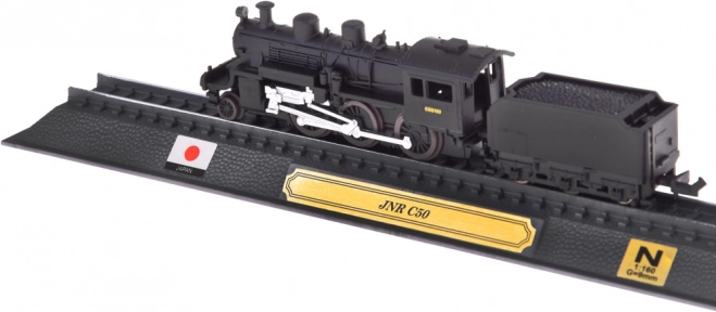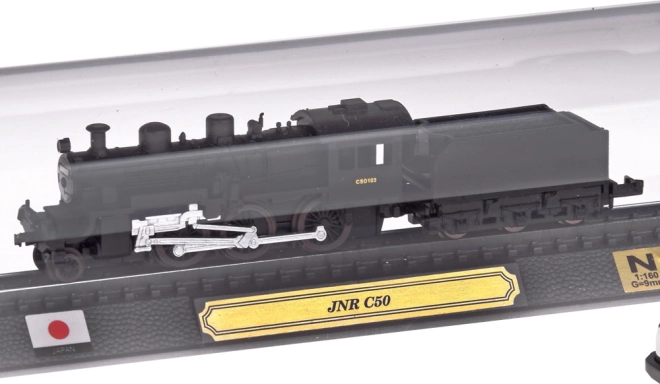 Detailiertes Modell der Dampflokomotive JNR C50 im Maßstab 1:160 mit realistischen Elementen von Karosserie und Fahrwerk auf einer Gleisbasis.