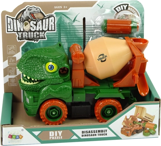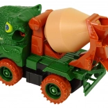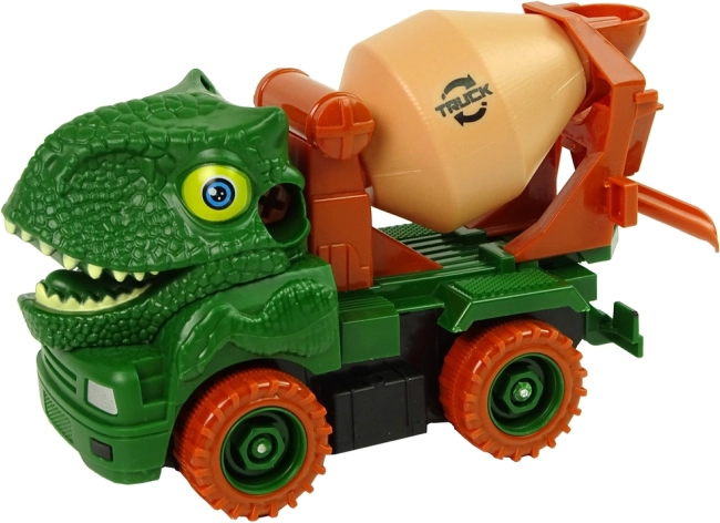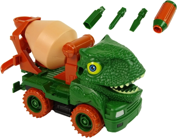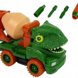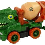 Ein Dinosaurierkopf mit markanten Zügen und eine rotierende Mischtrommel unterstützen kreative Bauszenen und fantasievolles Spiel.