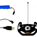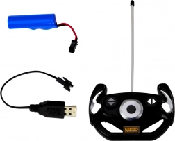 Fernbedienung im Lenkrad-Design mit Tasten und Metallantenne für bessere Manövrierbarkeit des Spielzeugs.