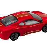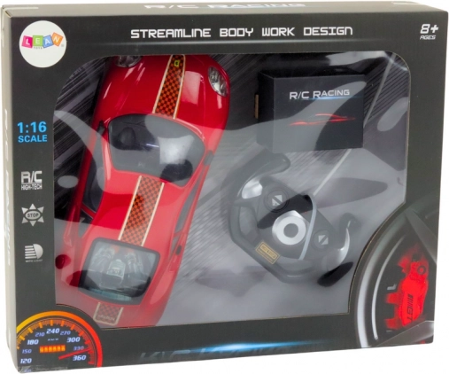 Rotes ferngesteuertes Auto mit schwarzen und orangefarbenen Details, das einem echten Sportwagen mit aerodynamischem Design ähnelt.