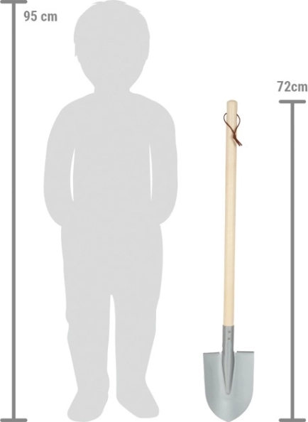 Der spitze, graue Spaten ist auf die Bedürfnisse von Kindern ausgelegt. Dank seines Gewichts und seiner Form bietet er eine komfortable Handhabung und unterstützt Kinder in der Entwicklung ihrer Motorik und ihrer Beziehung zur Natur. Der Spaten hat einen Holzgriff, der gut in Kinderhänden liegt, und einen Metallkopf, der robust ist und sich sowohl für die Arbeit in Beeten als auch im Sandkasten eignet.