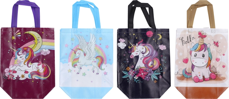 Wählen Sie aus 4 verschiedenen Designs mit kindgerechten Motiven, die sofort ins Auge fallen. Dank der stabilen Henkel lässt sich die Tasche bequem tragen und stellt eine ästhetische Alternative zu Papierverpackungen dar.