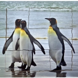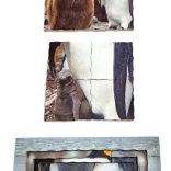 Entwicklungsphasen: Das Puzzle zeigt Eier mit einem Elternteil, frisch geschlüpfte Küken, ältere Küken beim Füttern und erwachsene Pinguine.