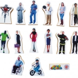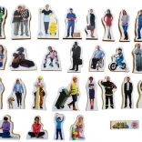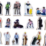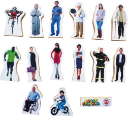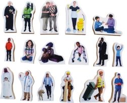 Dieses Set mit 33 realistisch dargestellten, frei stehenden Figuren repräsentiert ein Spektrum verschiedener Altersgruppen, Geschlechter, Berufe und Nationalitäten. Die Figuren haben eine Höhe zwischen 7,5 cm und 10,5 cm und sind aus MDF-Platte mit einer Dicke von 1,5 cm gefertigt.