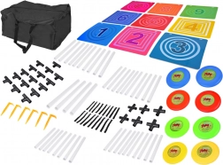Die Konstruktion ist schnell auf- und abgebaut, alle Teile passen in die robuste Tasche. Mit den Kunststoff-Erdspießen lässt sich die Zielscheibe draußen im Boden fixieren – ideal für Garten, Spielplatz und Turnhalle. Die bunten Scheiben sind leicht und sicher für Kinder.