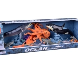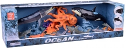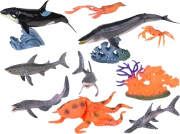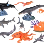 Das Set enthält verschiedene Arten von Meerestieren, einschließlich eines Wals, eines Tintenfisches, eines Orcas, eines Haifischs und mehr.