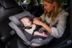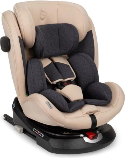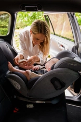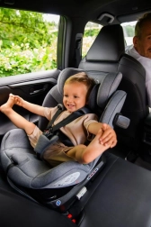 Einzigartig ist die drehbare Basis des Kindersitzes, die eine einfache Einstellung entgegen der Fahrtrichtung (RWF) sowie in Fahrtrichtung (FWF) ermöglicht. Der Sitz ist mit einem ISOFIX-System mit Indikator für die richtige Montage und einem Tether-Gurt für noch mehr Sicherheit ausgestattet.