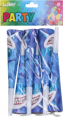 Starten Sie die Feier mit fröhlichen Party-Tröten mit Hai-Motiv! Die Packung enthält 6 Stück mit einer Länge von 20 cm – ideal für Kindergeburtstage und Themenpartys.