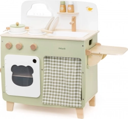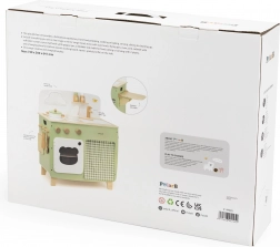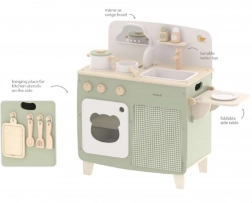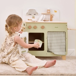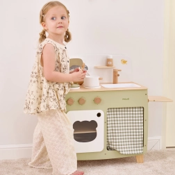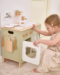 Die stilvolle Kinderküche in angenehmen Natur- und Grüntönen bietet Kindern ein realistisches Kocherlebnis. Dank der robusten Holzkonstruktion, drehbaren Knöpfe, Spüle und Backofen genießen kleine Köche stundenlang sicheres und kreatives Spiel. Die praktische klappbare Seitenablage vergrößert die Arbeitsfläche zum Schneiden oder Essen, während der Schrank mit Vorhang alle Schätze verstaut.