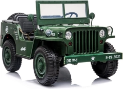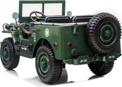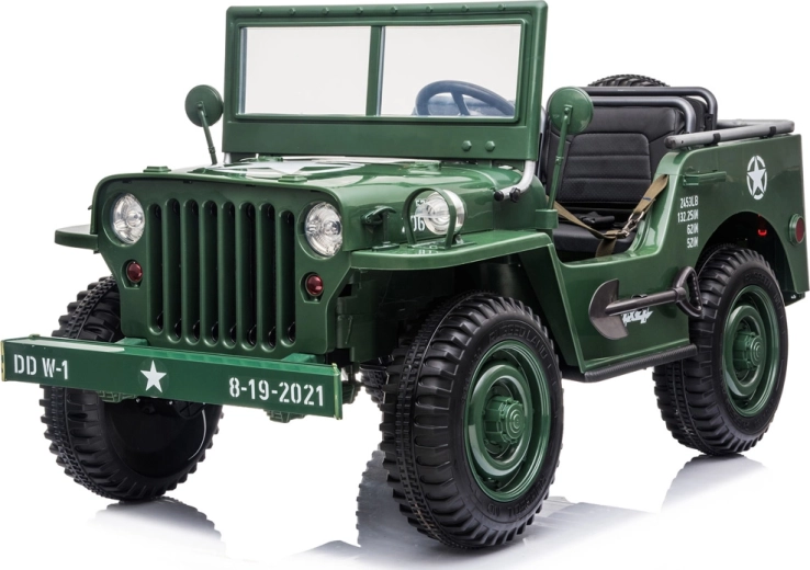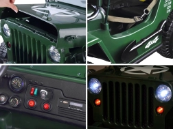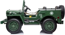 Militärisches Geländewagen für 3 Personen ist für alle Kinder, die Militärthemen mögen. Der militärische Jeep, ein starkes, leistungsfähiges, großes und massives Fahrzeug, das sicherlich die militärischen Aufgaben bewältigen wird. Wie es sich für ein solches Fahrzeug gehört, ist der militärische Geländewagen mit allen notwendigen Zubehörteilen und Ausrüstungen ausgestattet. Das Fahrzeug mit Allradantrieb hat die Möglichkeit eines doppelten Antriebs, so dass es von dem Fahrer abhängt, wann der entsprechende Antrieb verwendet wird. Das Fahrzeug verfügt über Stauräume, einen Kofferraum und eine Schaufel. Es hat Soundeffekte, Lichteffekte, eine klappbare Windschutzscheibe, breite Sitze. Das Fahrzeug kann mit einer Fernbedienung oder eigenständig vom Fahrer gesteuert werden.