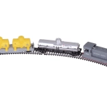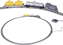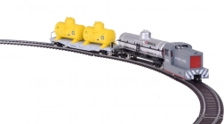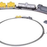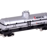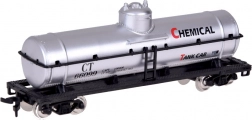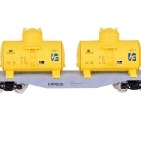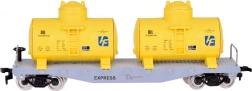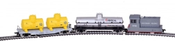 Flachwagen mit zwei gelben Kesseln und separatem silbernen CHEMICAL-Kesselwagen. Drehgestelle ermöglichen ein sanftes Durchfahren von Kurven.