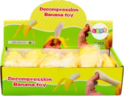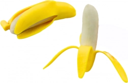 Die gelbe Schale, am Ende geöffnet, zeigt das helle Bananenfruchtfleisch im Inneren, das man drücken, kneten und dehnen kann. Das quetschbare Material ist außergewöhnlich flexibel und langlebig, sodass das Spielzeug auch nach intensiver Nutzung in seine ursprüngliche Form zurückkehrt.