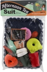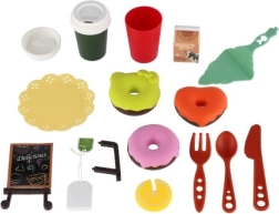 Enthalten sind ein dekoratives blaues Tablett, eine Kaffeetasse, eine kleine Kanne, eine Flasche/Becher, ein Milchbehälter, Besteck und verschiedene süße Leckereien. Das Set fördert soziale Fähigkeiten, Kommunikation und Fantasie beim Spielen mit Freundinnen und Freunden.