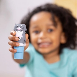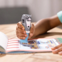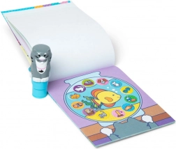 Genießen Sie endlose Möglichkeiten mit unserem Set: Ein Stempel in Form einer grauen Katze mit weißem Schnäuzchen und rosa Näschen, ein Einlegemodul mit 300 Aufklebern mit Tiermotiven, und ein 24-seitiges farbiges Buch zum Erstellen der eigenen Tiergeschichte.