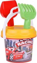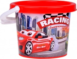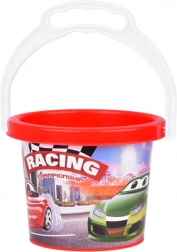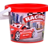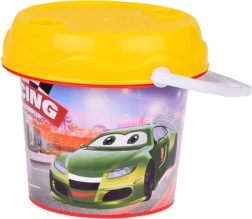 Der bunte Eimer mit Rennmotiv motiviert Kinder zum Spielen und lässt sich dank des robusten Henkels leicht tragen. Perfekt für Wasser und Sand.
