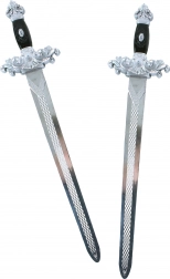 Zum Set gehören zwei identische silberne Schwerter mit einer Länge von 49 cm und dekorierten Griffen – ideal für Duelle oder Spiele zu zweit.