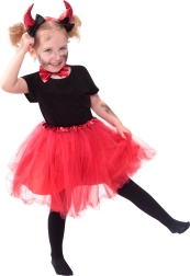 Der Rock hat einen Gummizug in der Taille für einfaches Anziehen und angenehmen Tragekomfort. Ergänzt wird das Set durch einen Haarreif mit Hörnern und eine elegante Halsfliege, die den teuflischen Look auch ohne weitere Accessoires perfekt abrunden.