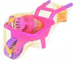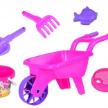 Die rosa Schubkarre mit violettem Rad ist für kleine Hände gemacht – leicht, stabil und ideal zum Transportieren von Sand, Spielzeug oder Laub.