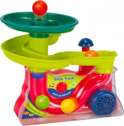 Die interaktive Fontäne mit Rutsche verfügt über einen großen Knopf, der bei Betätigung den gesamten Mechanismus aktiviert. Die Fontäne schleudert fünf bunte Bälle in die Luft und schafft so ein beeindruckendes Schauspiel, das die Aufmerksamkeit des Kindes auf sich zieht.