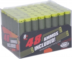 Packung mit 48 Stk. Ersatz-Schaumstoffgeschossen mit den Maßen 7 × 1,3 cm für schnelles Nachladen. Leichter Schaumstoff, schonend für die Umgebung und angenehm in der Anwendung. Ausgelegt für ausgewählte Modelle desselben Herstellers.