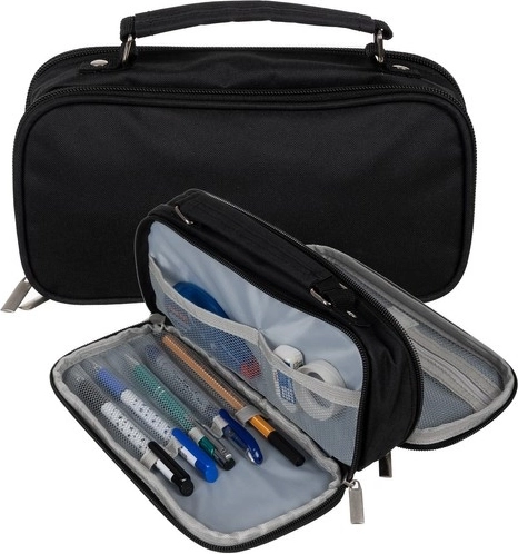 Praktisches und robustes Federmäppchen mit zwei Fächern und stabilem Tragegriff für leichtes Mitnehmen. Durchdachte Organisation dank Netzfächern, Riemen und elastischen Haltern, die Ihre Utensilien übersichtlich und schnell griffbereit halten. Hergestellt aus strapazierfähigem Polyester und mit Zwei-Wege-Reißverschlüssen für komfortables Öffnen ausgestattet.
