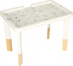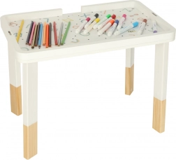 Der Tisch besteht aus hochwertigem Holz mit abgerundeten Kanten und ist mit ungiftigen Farben lackiert. Er erfüllt die europäischen Sicherheitsnormen (CE). Dank der praktischen Tischplatte lässt er sich auch hervorragend als Platz zum Schreiben, Zeichnen und kreativen Gestalten nutzen.