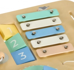 Xylophon, Formensortierer, Zahnräder mit Schiebeelementen und das Perlenlabyrinth beschäftigen Kinder lange und fördern auf natürliche Weise Feinmotorik und Logik.