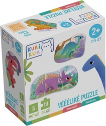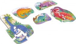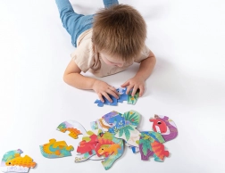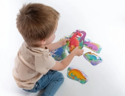 Jeder Dinosaurier ist ein eigenes Puzzle mit vereinfachter Form. Kinder üben das Zusammenlegen und entdecken dabei die Welt prähistorischer Tiere.