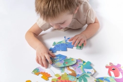 Große, farbenfrohe Teile aus stabilem Karton erleichtern die Handhabung und fördern die Auge-Hand-Koordination sowie die Geduld beim Puzzeln.