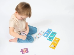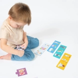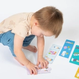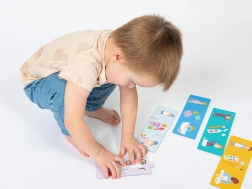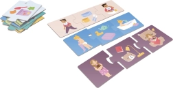 Auf dem linken Teil ist ein Kind, das für eine Tätigkeit bereit ist, in der Mitte befinden sich die Utensilien oder Spielzeuge und auf dem rechten Teil die eigentliche Aktivität. Aus 24 stabilen Teilen (2 mm Karton) entstehen 8 thematische Trios, die sich auch als Zeitleiste des Tages anordnen lassen.