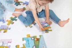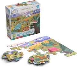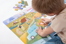 Dieses große Kinderpuzzle besteht aus 24 extra großen Teilen und ergibt zusammengesetzt ein Bild von 675 × 470 mm. Die Form der Verbindungen ist so gestaltet, dass sich nur die richtigen Bildteile verbinden lassen – das hilft Kindern, Zusammenhänge zu lernen und stärkt ihre Geduld. Die Teile sind aus hochwertigem, 2 mm starkem Karton gefertigt, der auch kräftigerem Umgang standhält.