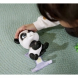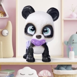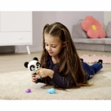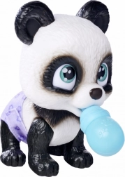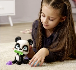Der Panda trinkt Wasser aus der mitgelieferten Flasche und pinkelt danach in die Windel, die sich bei Nässe gelb färbt, für ein authentisches Spielerlebnis.