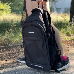 Der großvolumige Rucksack mit 45 l aus strapazierfähigem Oxford 600D widersteht mechanischer Abnutzung und widrigen Wetterbedingungen. Das Innere ist mit Oxford 210D gefüttert, der Rücken ist vollflächig mit EPE-Schaum gepolstert – für mehr Komfort und Schutz des Inhalts vor Stößen. Ein reflektierender Streifen verbessert die Sichtbarkeit.