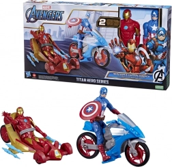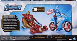 Iron Man und Captain America haben ihre spezifischen Fahrzeuge – ein rotes Auto für Iron Man und ein blaues Motorrad für Captain America.