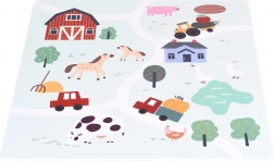 Die Bauernhof-Illustration mit Tieren, Scheune und Wegen zieht Kinder in kreatives Spiel hinein. Leuchtende Farben und detaillierte Motive fördern Fantasie und Sinneswahrnehmung.