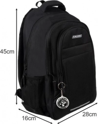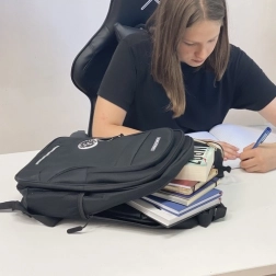 Die praktische Aufteilung umfasst ein Hauptfach mit zwei Schiebern für bequemes Öffnen, ein gepolstertes Fach für Laptop/Tablet, ein zweites Fach für Hefte und flache Unterlagen, eine Fronttasche für Snacks und Kleinigkeiten sowie seitliche Netztaschen für eine Flasche. Ein reflektierender Streifen erhöht die Sichtbarkeit in der Dämmerung. Der Rucksack ist vielseitig – für die Schule, die Arbeit, das Training und die Freizeit.