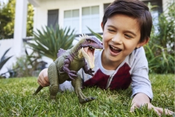 Das Steuerrad aktiviert dynamische Bewegungen und Sounds: Beim Vorschieben greift der Kopf nach unten an mit Beißeffekt und Knurren, beim Zurückdrehen weicht der Kopf mit Brüllen zurück und der „kampfbereit“-Modus mit ausgefahrenen Schwanzstacheln wird aktiviert. Ein versteckter Code ermöglicht die Verbindung mit der Jurassic World App, in der Sie die digitale Version des Dinosauriers und weitere interaktive Inhalte freischalten.