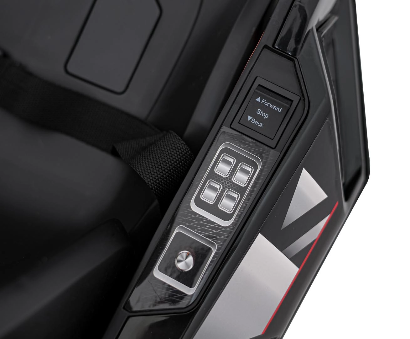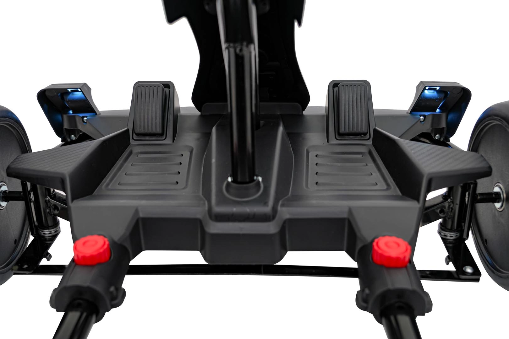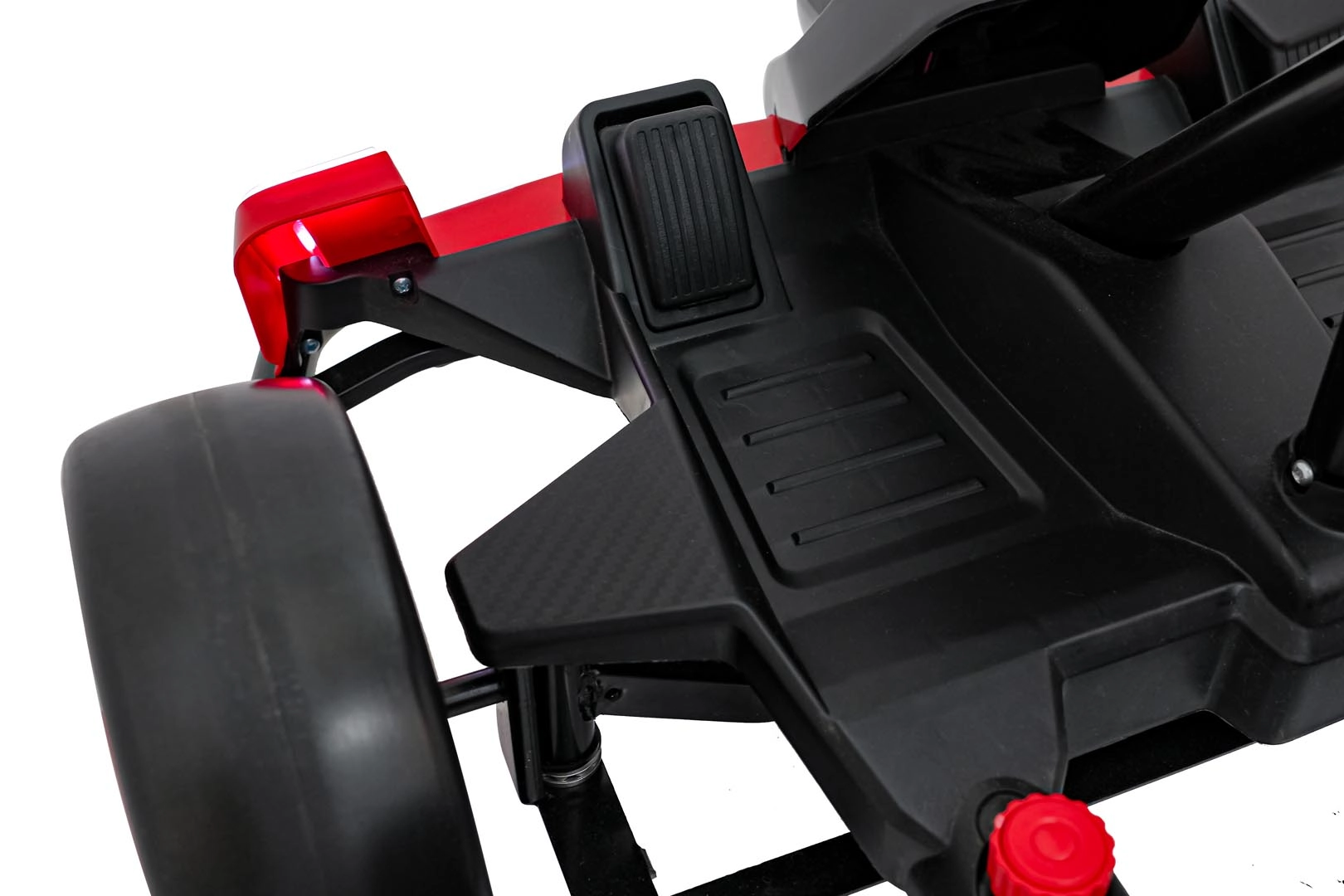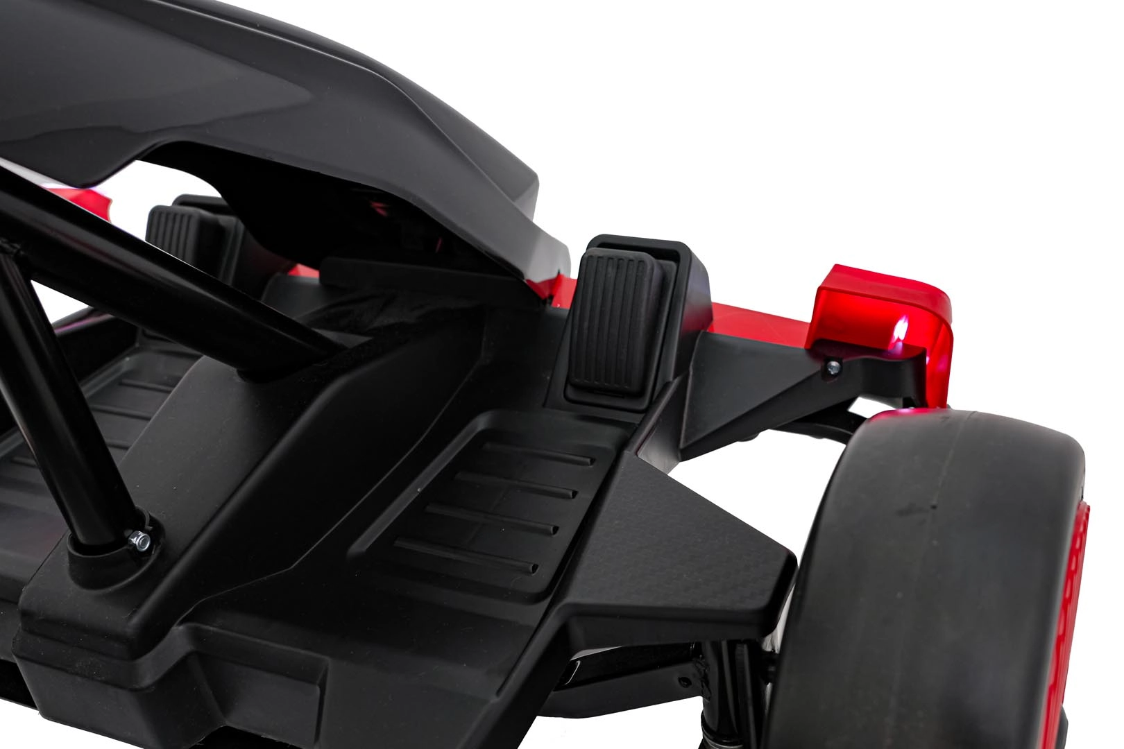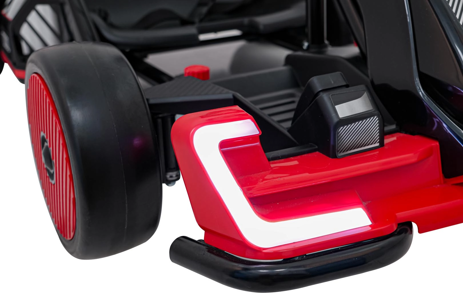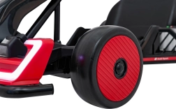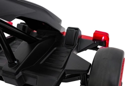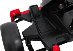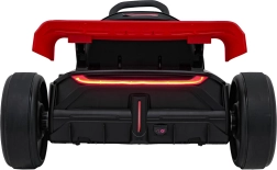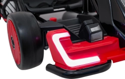 Für Unterhaltung unterwegs sorgt das umfangreiche Audio-Panel mit Bluetooth, USB, MP3 und FM-Radio sowie der Motorsounds beim Start und die effektvollen LED-Lichter vorne und hinten. Vordere EVA-Schaumräder dämpfen Unebenheiten, während die hinteren Kunststoffräder speziell für Drifts ausgelegt sind.