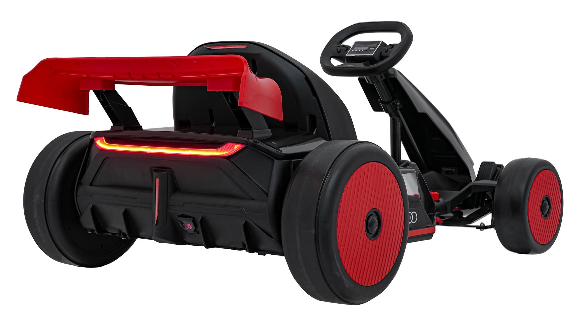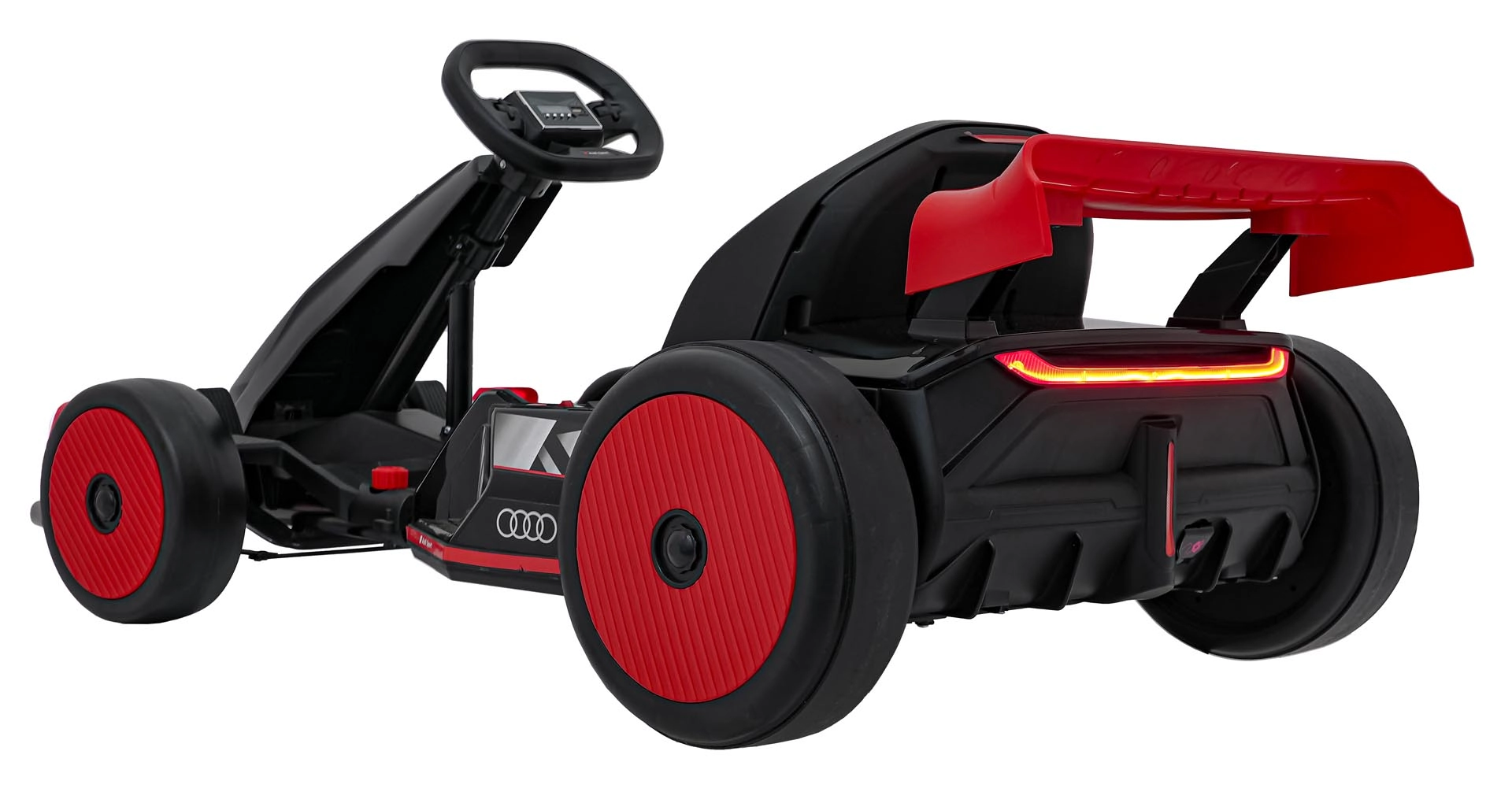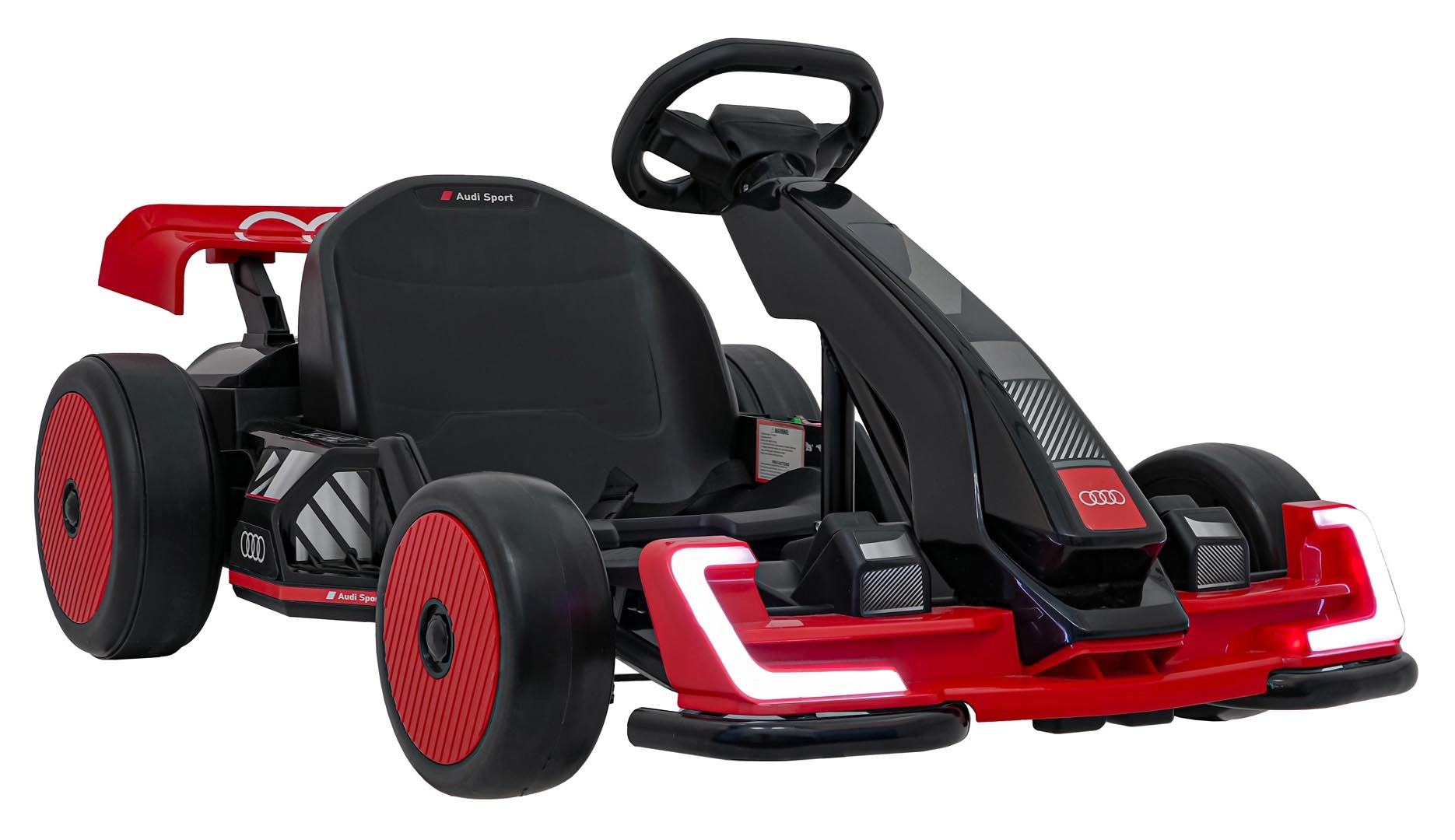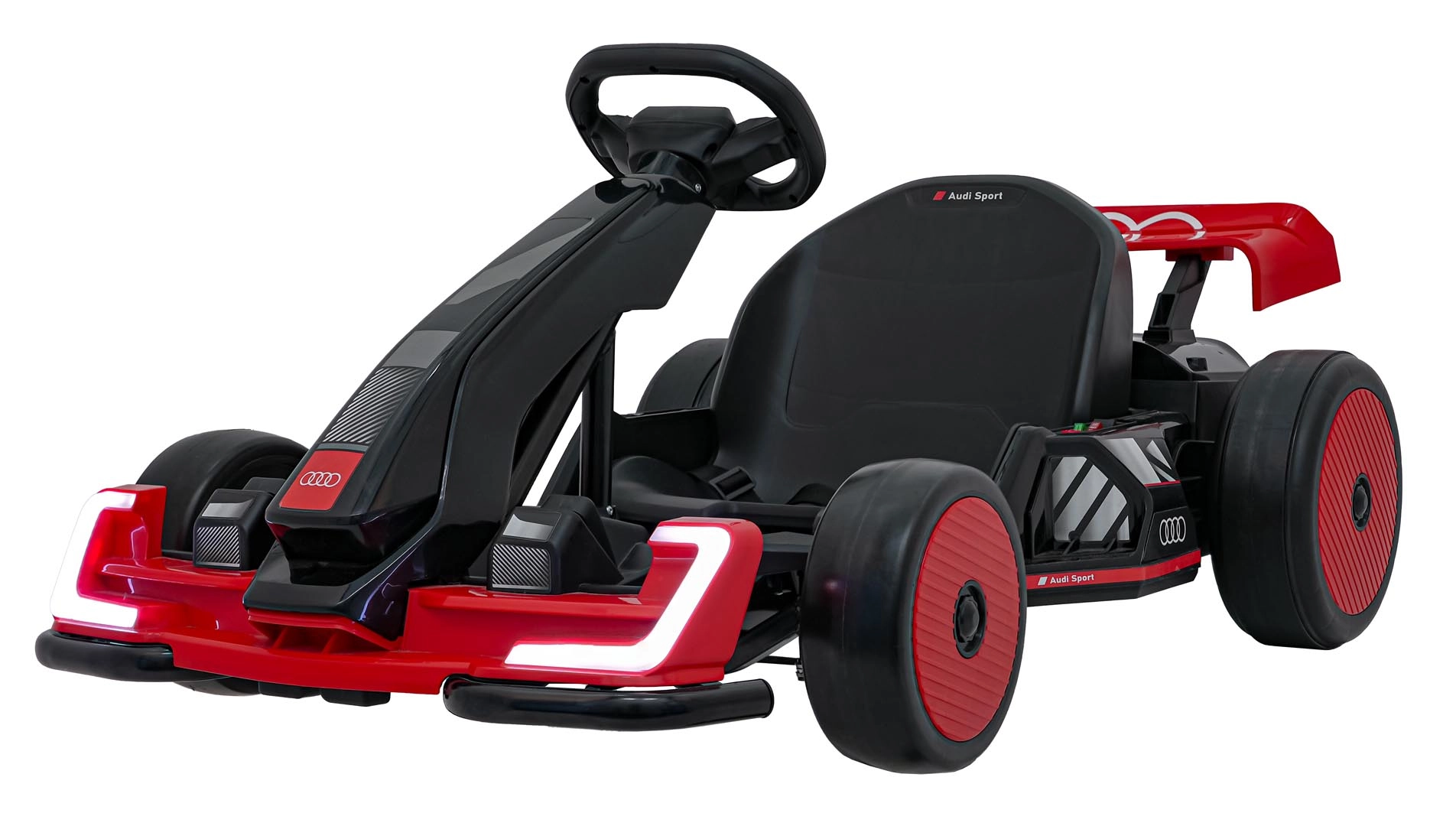 Front- und Rück-LED-Beleuchtung für bessere Sichtbarkeit und einen unverwechselbaren Look, inspiriert von Audi Sport. Stilvoller Spoiler und breite Räder unterstreichen die Dynamik.
