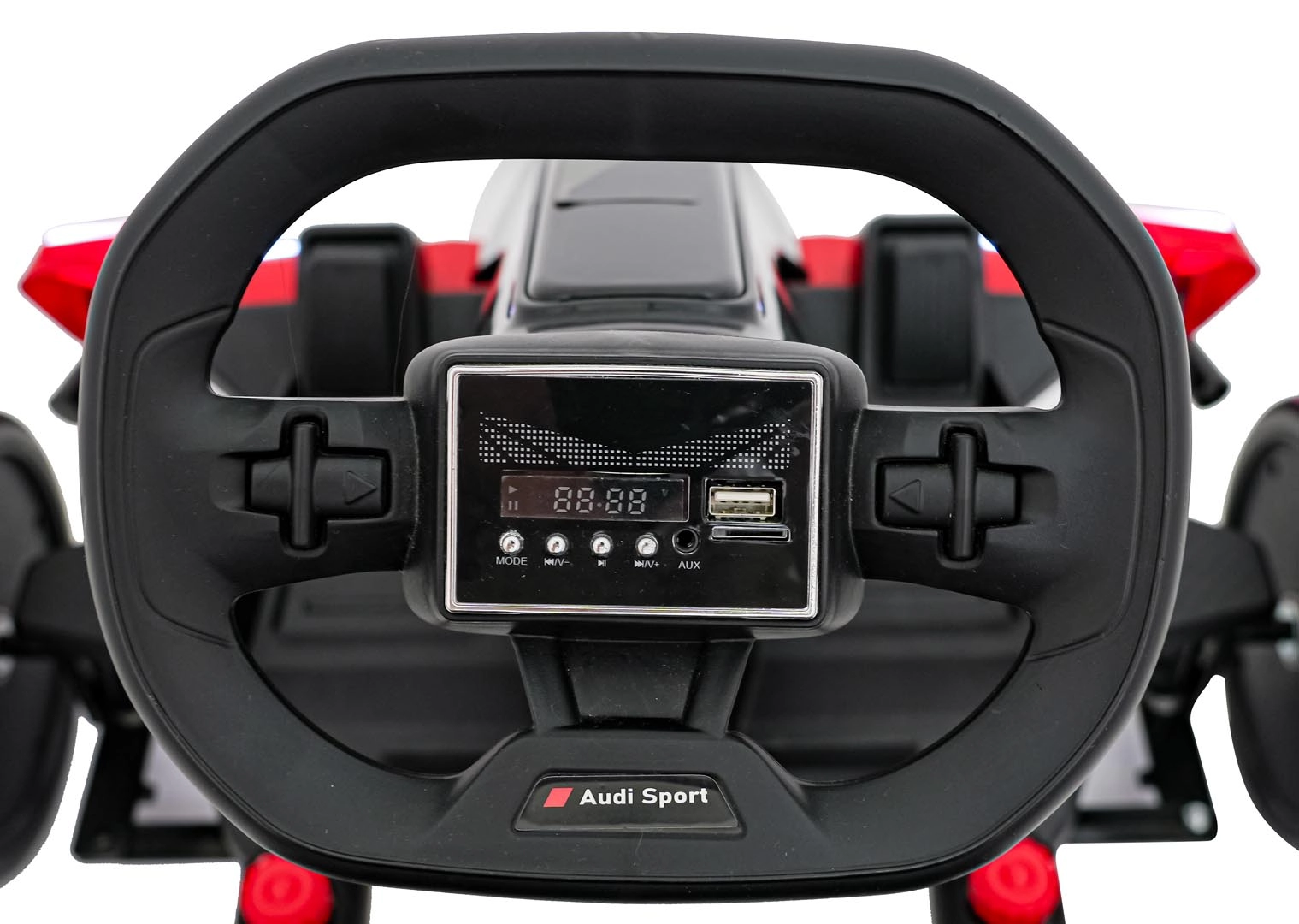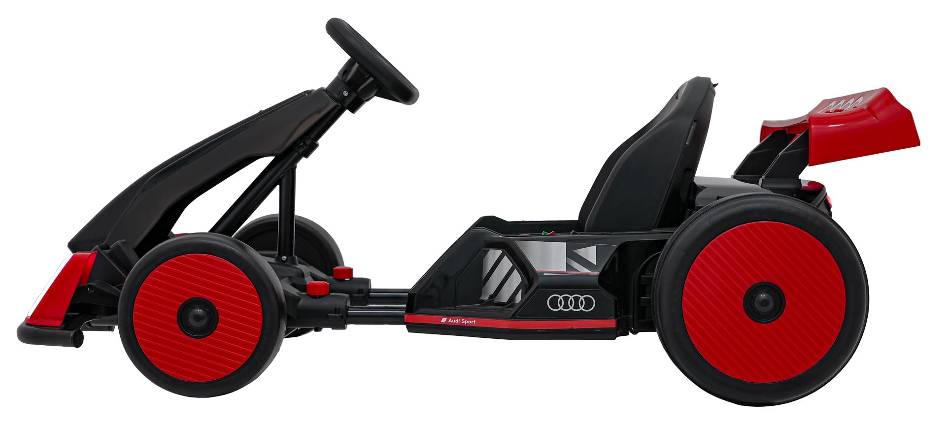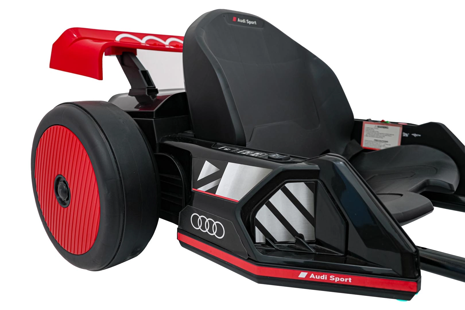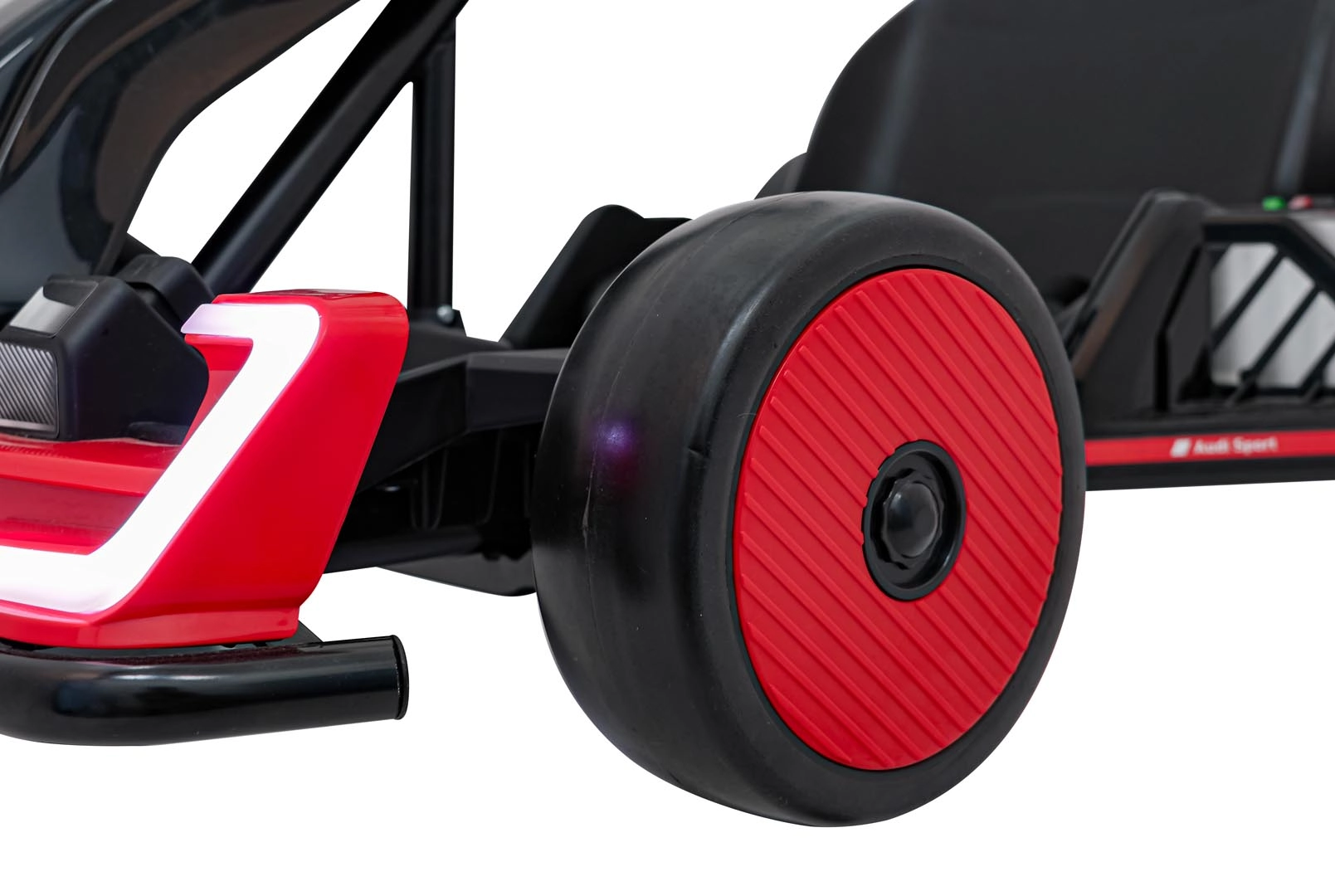 Front- und Rück-LED-Beleuchtung für bessere Sichtbarkeit und einen unverwechselbaren Look, inspiriert von Audi Sport. Stilvoller Spoiler und breite Räder unterstreichen die Dynamik.