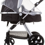 Großes verstellbares Verdeck mit Sonnenblende, gepolsterte 5-Punkt-Gurte, geräumiger Korb, abnehmbarer Bügel, Fußsack, Tasche, Getränkehalter und Moskitonetz – alles im Lieferumfang enthalten.