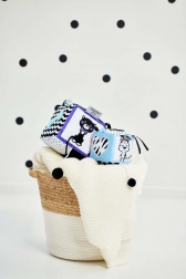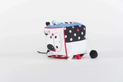 Abstehende Elemente wie Kuh-Ohren und Tigerschwanz erleichtern das Greifen und trainieren den Griff. Das praktische Täschchen mit Plüschball an einer Schnur unterstützt das Hineinstecken und Herausnehmen – ideal für die Hand-Auge-Koordination. Der integrierte baby-sichere Spiegel zieht die Aufmerksamkeit auf sich und hilft, das eigene Spiegelbild wahrzunehmen, während Etiketten/Bändchen auf einer weiteren Seite den Tastsinn und die Finger stimulieren.