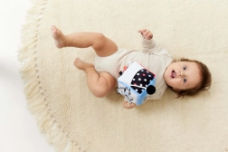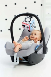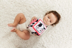 Der hohe Kontrast schwarz-weißer Motive mit farbigen Details stimuliert das Sehvermögen und hält die Aufmerksamkeit des Babys während des Spielens.