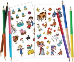 Im Set enthalten sind 2 Stickerbögen und 6 doppelseitige Buntstifte, sodass Ihr Kind sofort und ohne weiteres Zubehör kreativ werden kann. Die praktische Lösung für Urlaub, Auto, Zug und Wartezimmer.
