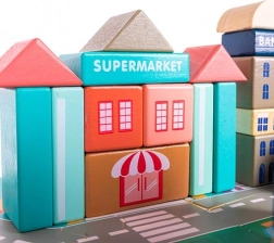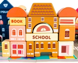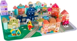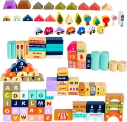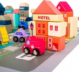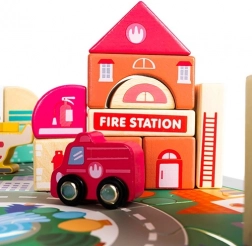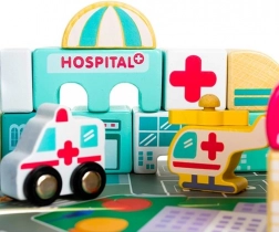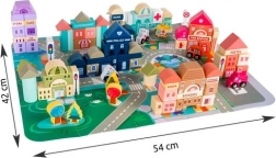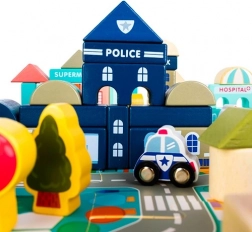 Die umfangreiche Ausstattung umfasst Gebäude wie Schule, Krankenhaus, Feuerwehrwache, Polizei, Bank, Buchhandlung, Supermarkt, Museum und Café sowie 7 Fahrzeuge (Polizei, Feuerwehr, Krankenwagen, Taxi, Schulbus, Auto, Hubschrauber). Die Holzteile sind sorgfältig geschliffen, die Kanten abgerundet und die Farben ungiftig – ideal für sicheres Kinderspiel.
