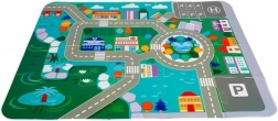 Die Puzzle-Unterlage bildet einen übersichtlichen Stadtplan mit Straßen und Flächen für Gebäude, sodass sich Kinder leicht orientieren können und das Spiel geordnet und fesselnd bleibt.